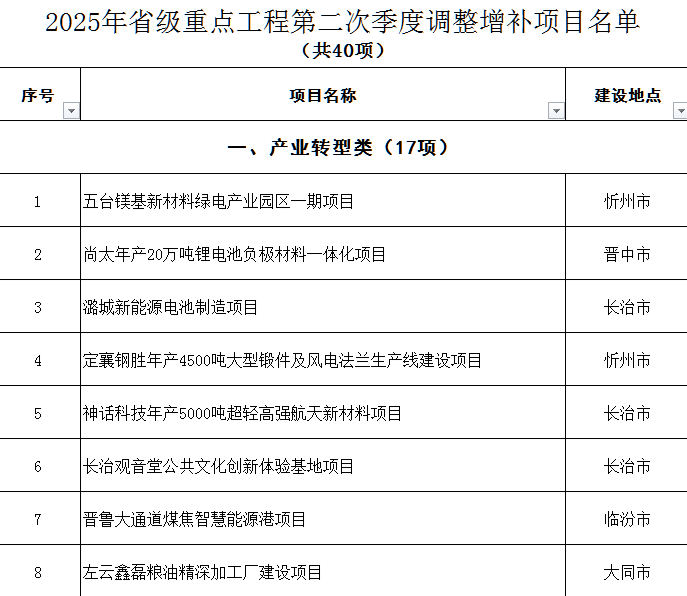 9月5日,山西省發展和改革委員會印發2025年省級重點工程第二次季度調整項目名單。調整名單包含增補項目40個,退出項目10個。